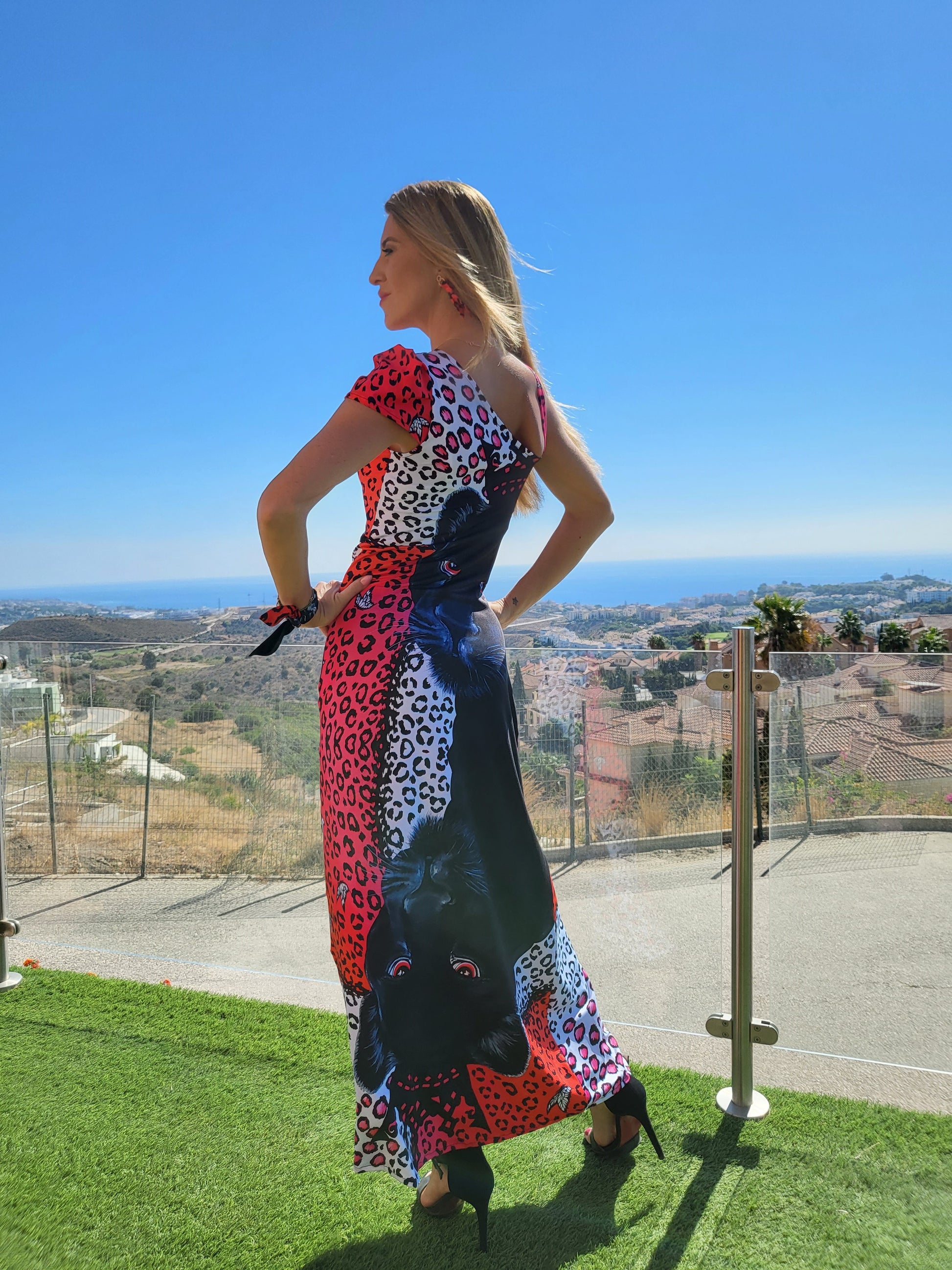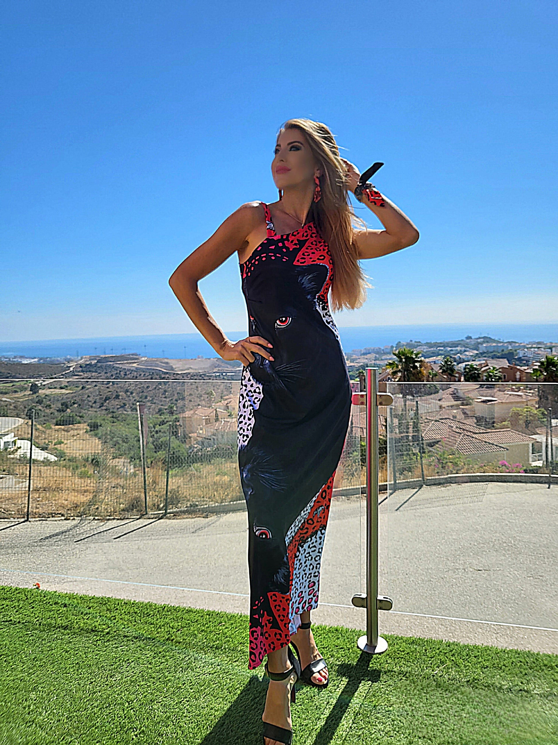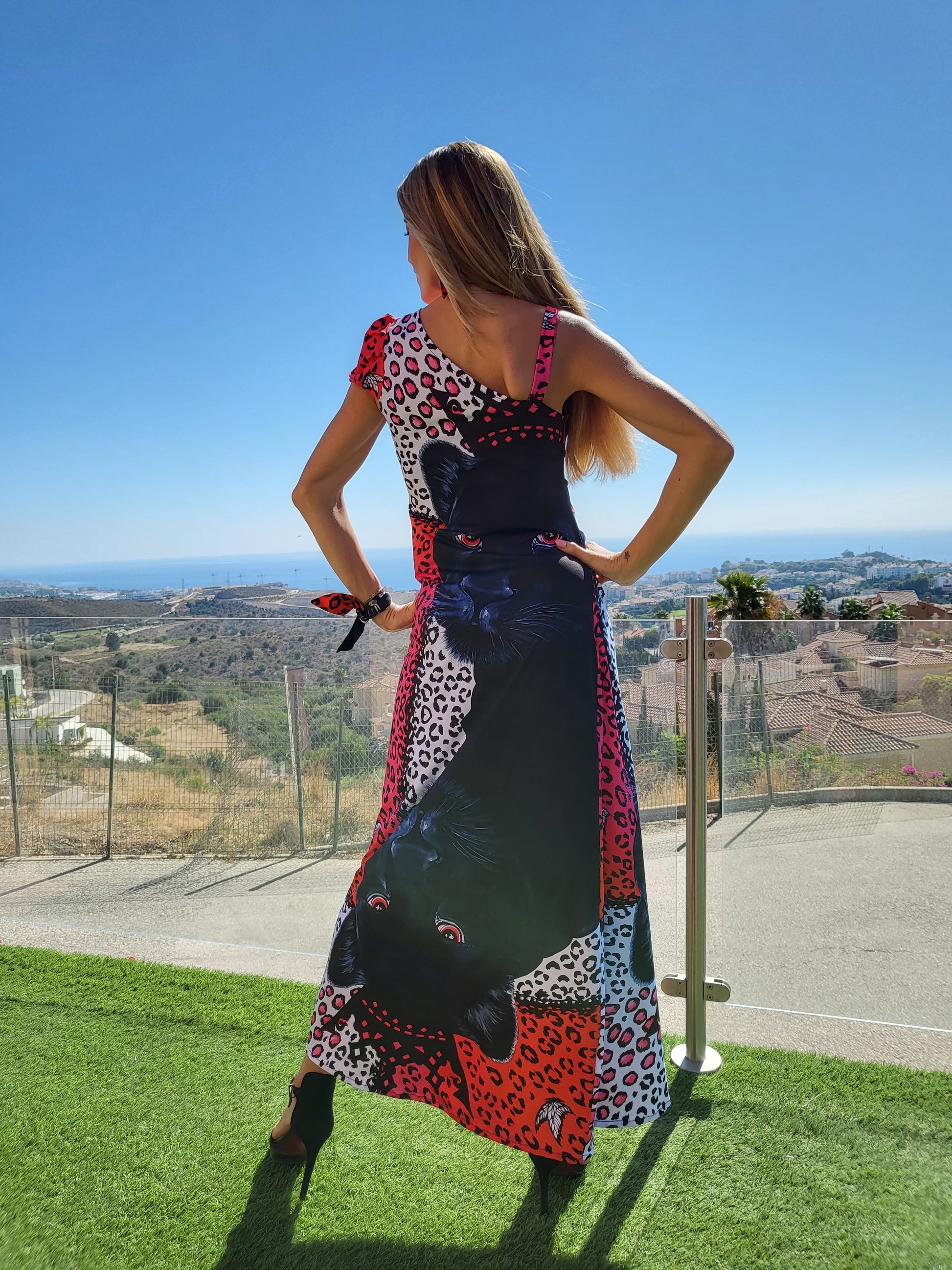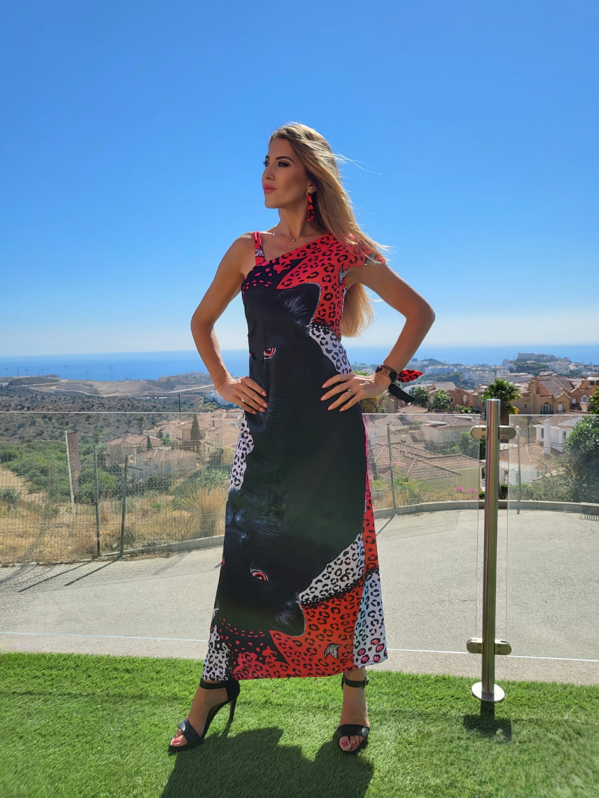 Juodojo leopardo vieno peties suknelė – elegantiška ir moteriška apranga, tinkanti tiek kasdienai, tiek šventėms. Lengvas audinys ir išskirtinis dizainas pabrėžia figūrą ir suteikia pasitikėjimo.