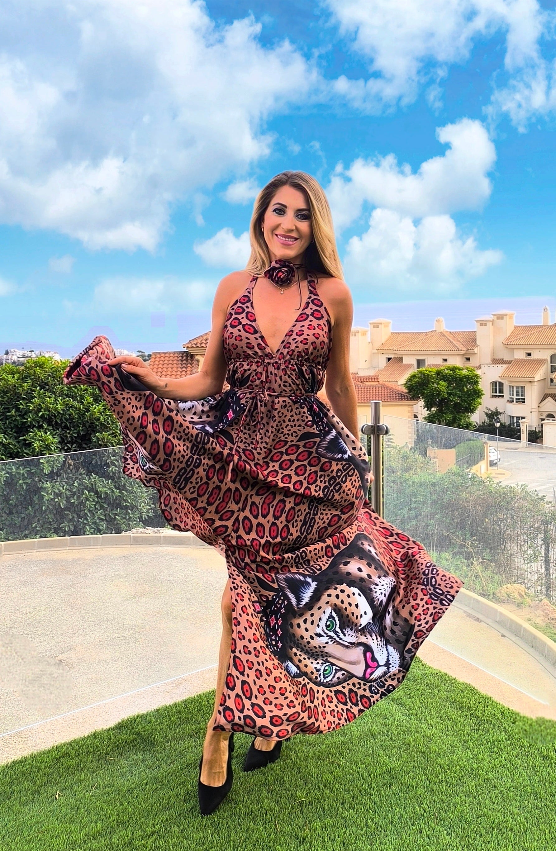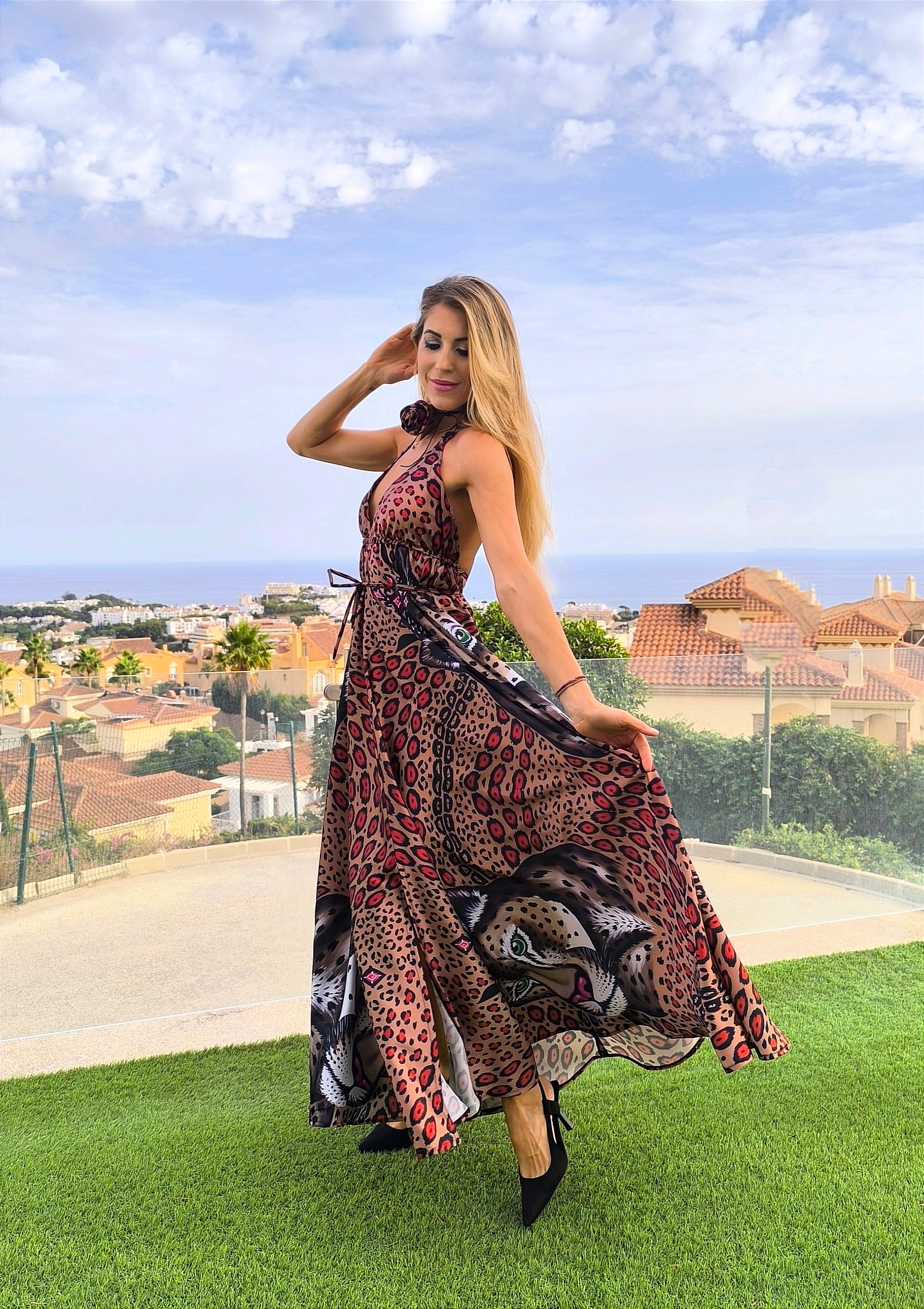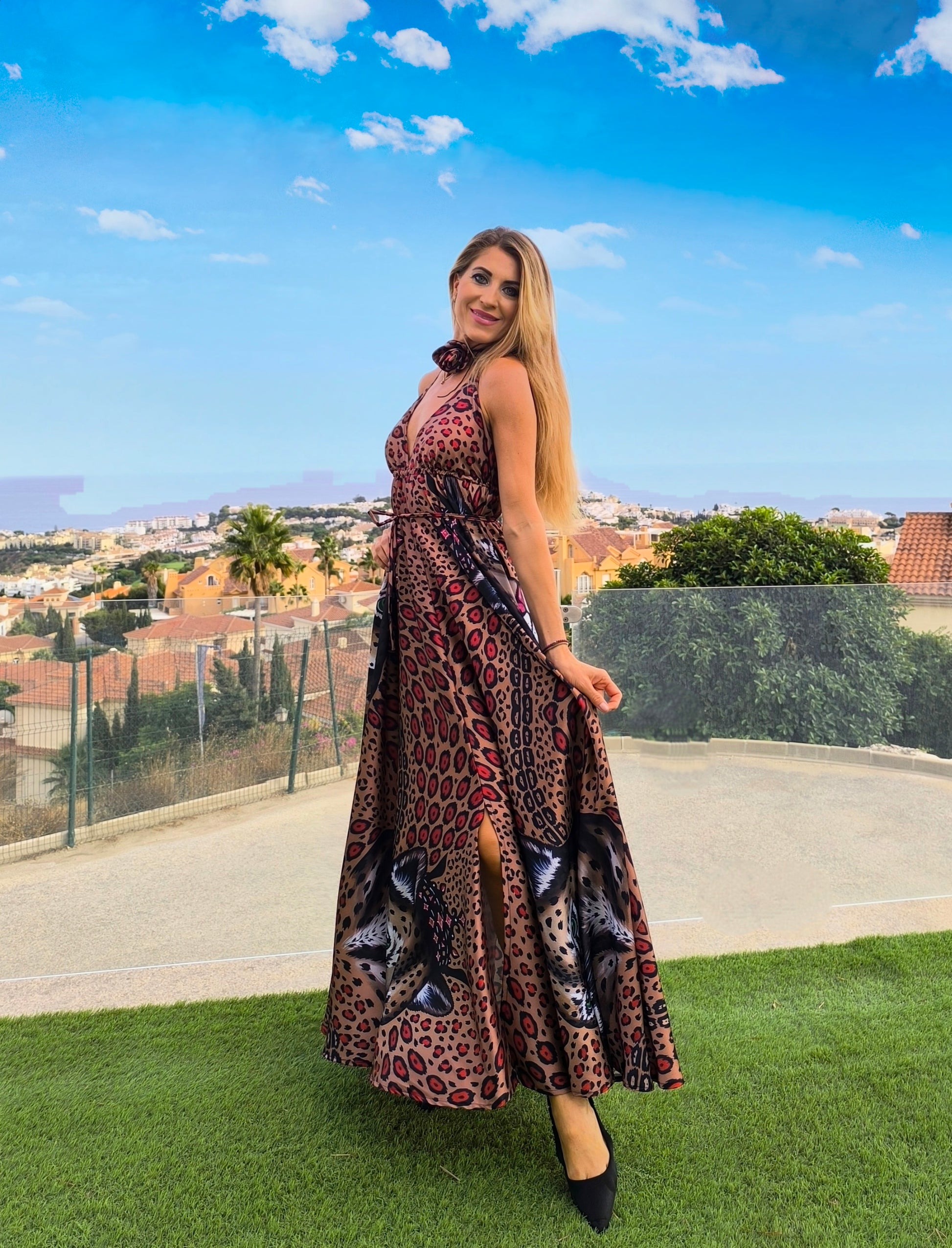 Leopardo ir raudono gyvūno ilga suknelė – elegantiška ir moteriška apranga, tinkanti tiek kasdienai, tiek šventėms. Lengvas audinys ir išskirtinis dizainas pabrėžia figūrą ir suteikia pasitikėjimo.