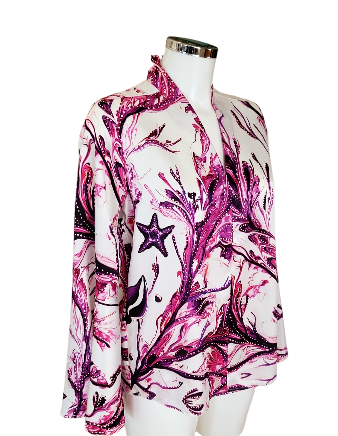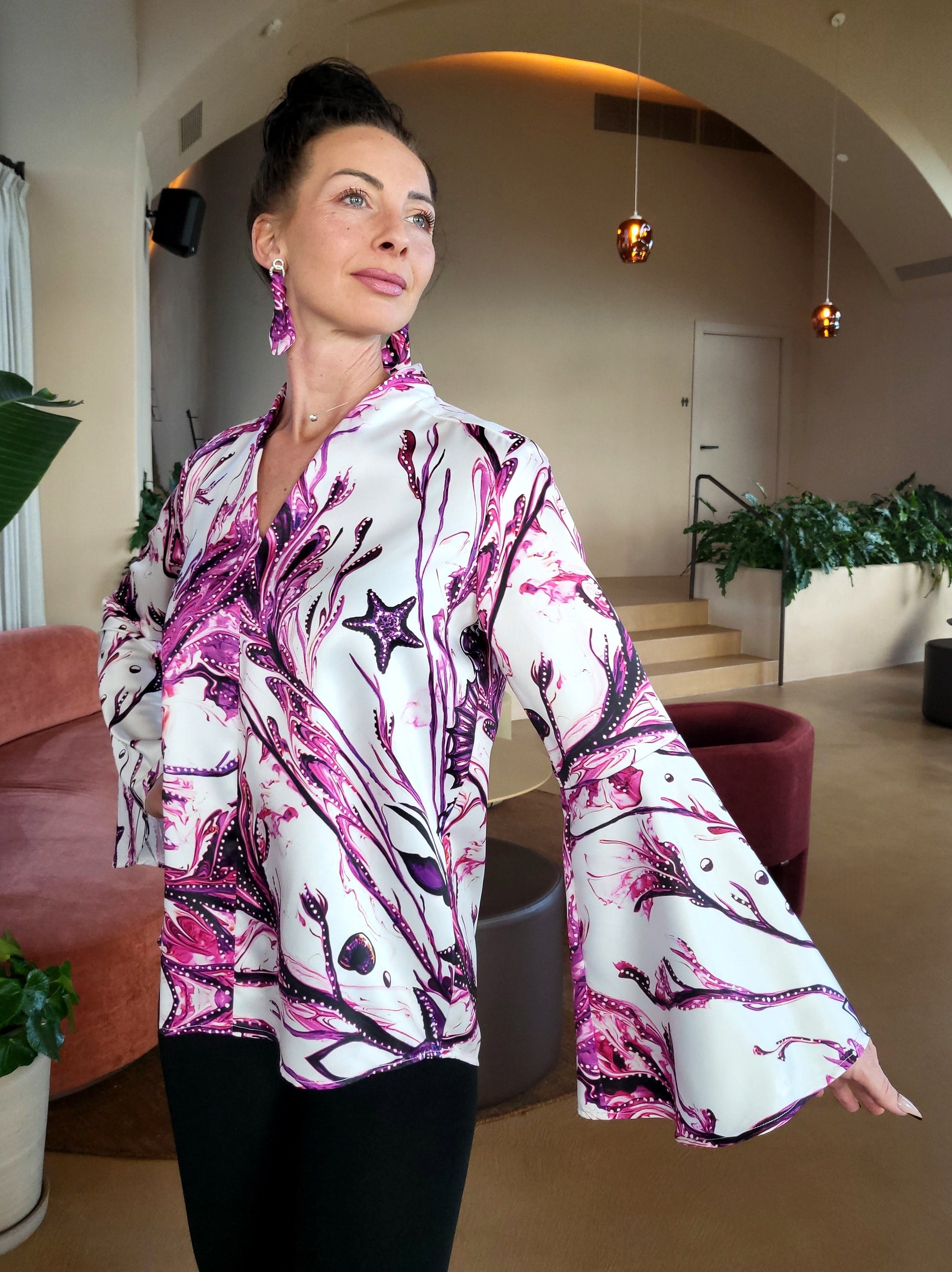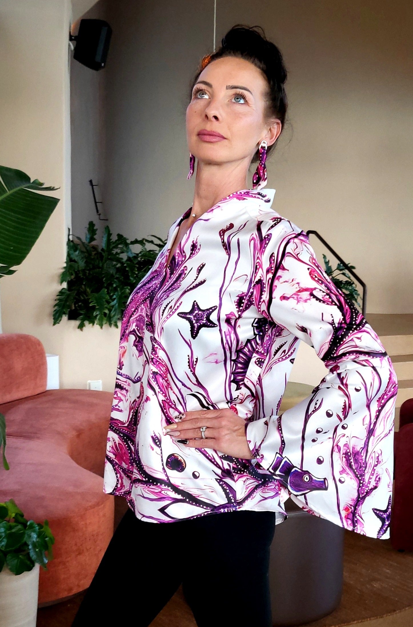 Violetinio jūrų arkliuko palaidinė ilgomis rankovėmis – universali viršutinė dalis, tinkanti tiek biurui, tiek laisvalaikiui. Stilingas dizainas ir patogus kirpimas leis jaustis užtikrintai kiekvieną dieną.